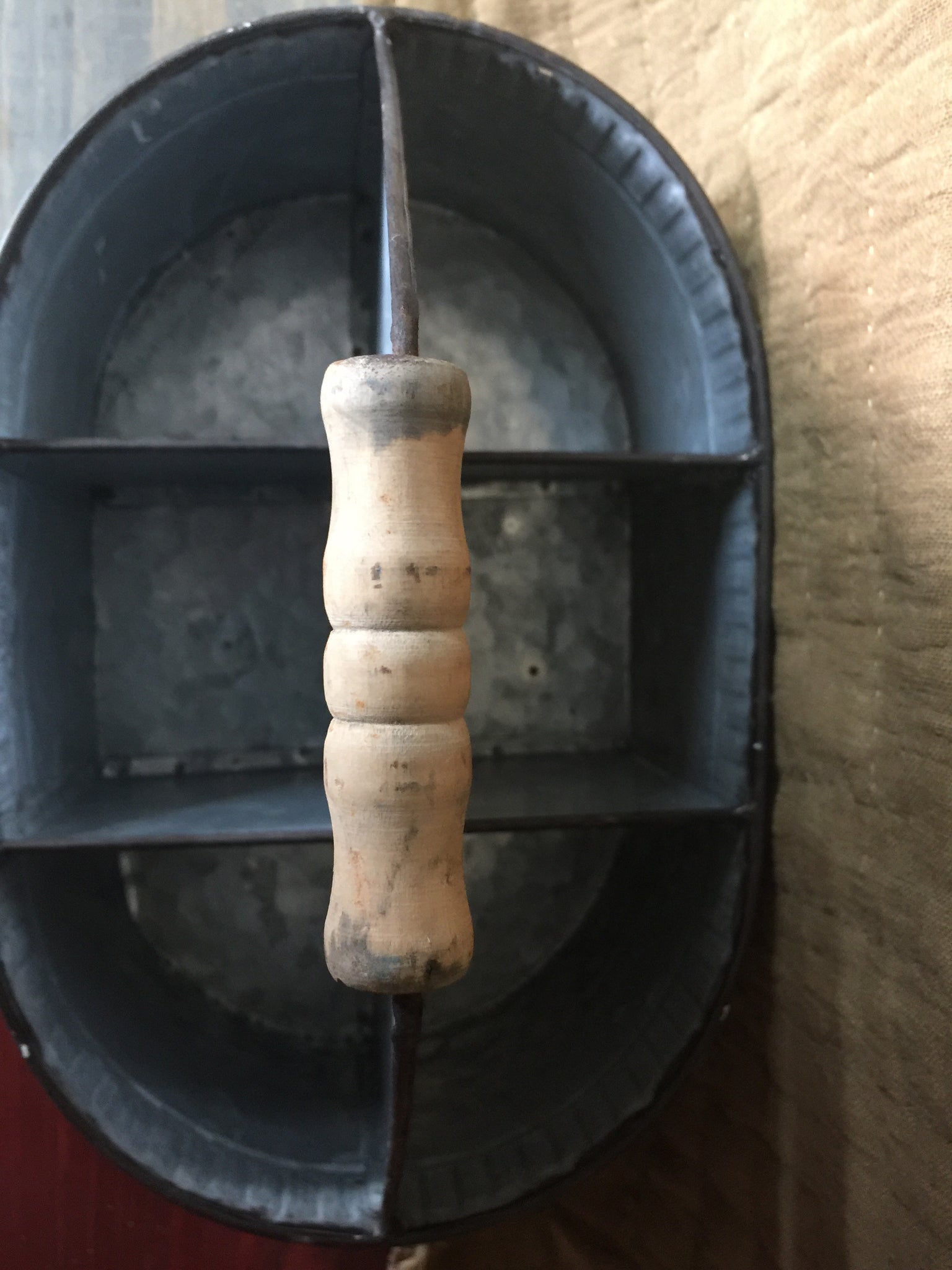 Metal/tin storage bucket with six divided compartments and a wooden handle