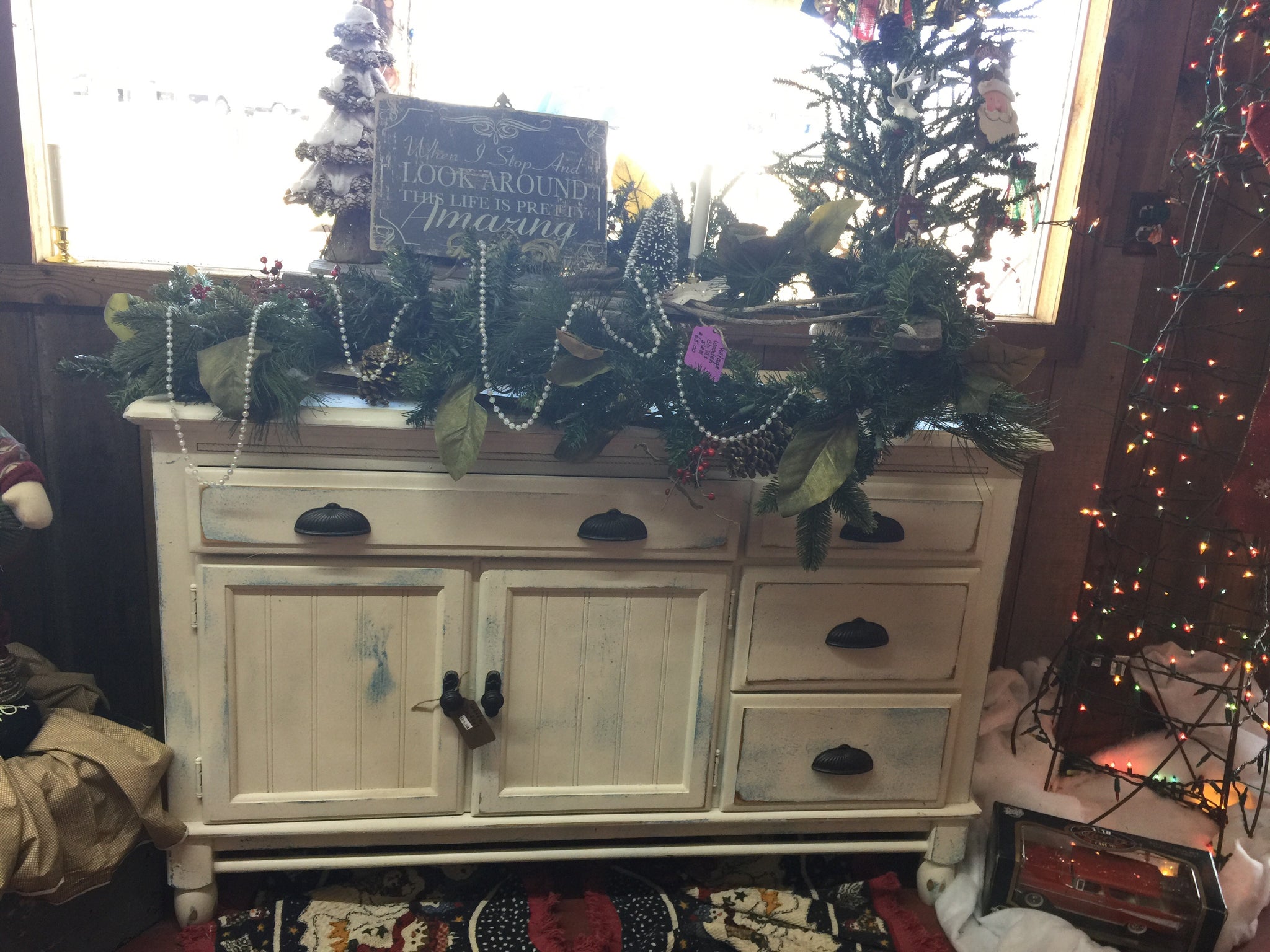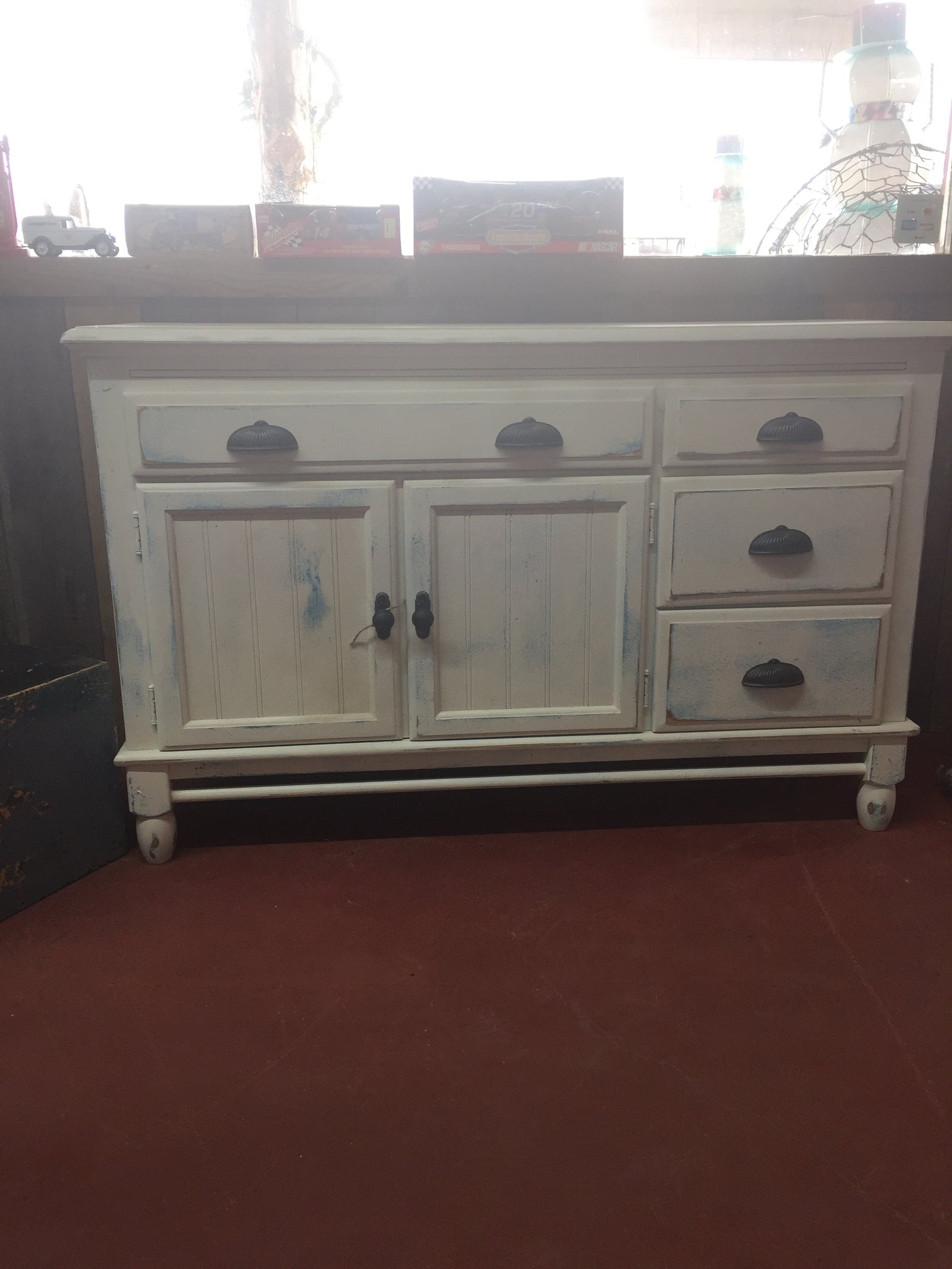 Solid wood old buffet shabby chic heirloom  white with a blast of turquoise gleam!  Won’t lost long!